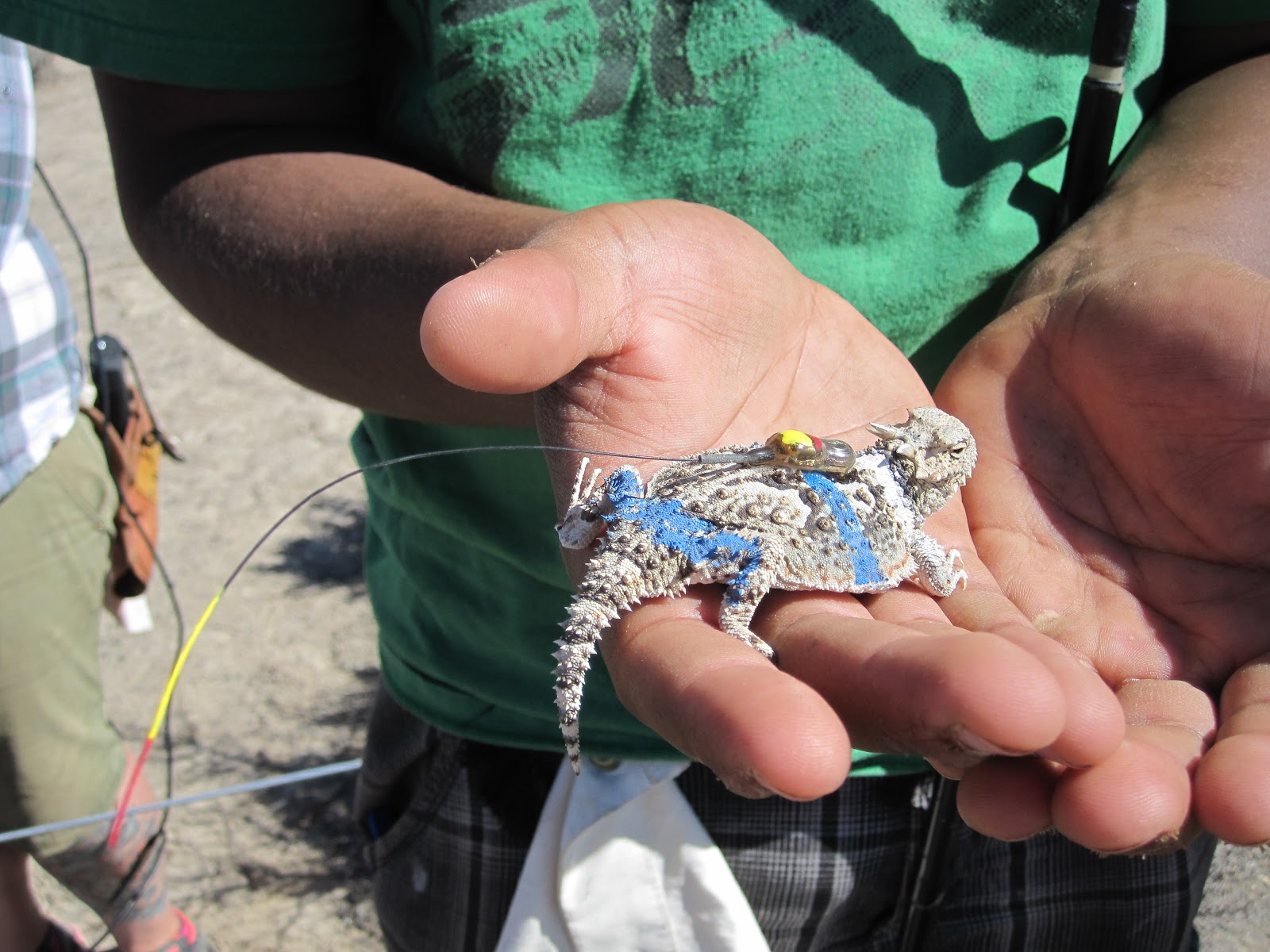 This horned lizard has a red and yellow radio transmitter glued to her back that allows researchers to find her and study her movement throughout the day. |